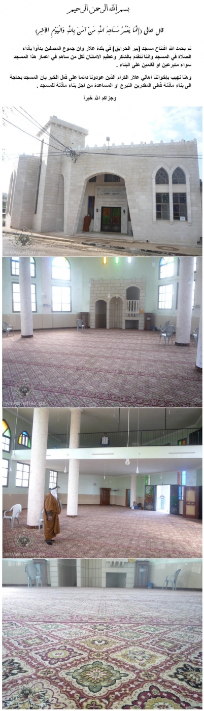تم بحمد الله افتتاح مسجد (بير الحرايق) في بلدة علار وان جموع المصلين بدأوا بأداء الصلاة في المسجد واننا نتقدم بالشكر وعظيم الامتنان لكل من ساهم في اعمار هذا المسجد سواء متبرعين او قائمين على البناء .