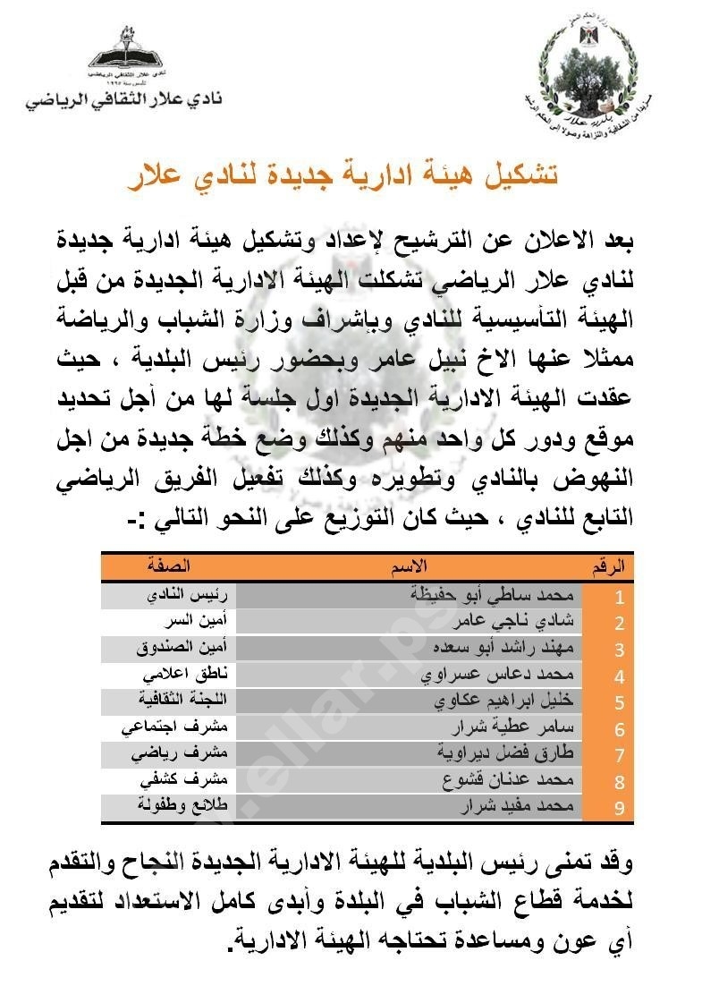 تشكيل هيئة ادارية جديدة لنادي علار