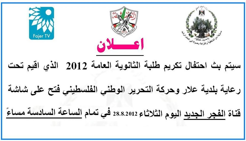 اعلان - بث احتفال التوجيهيللمشاهدة من خارج محافظة طولكرم الدخول على موقع الفجر الجديدhttp://www.alfajertv.comومنه الذهاب الي بند البث المباشر