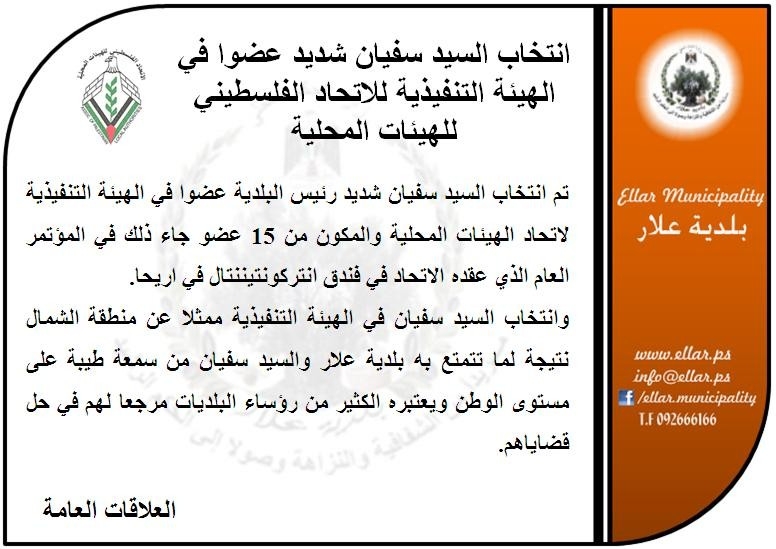 انتخاب السيد سفيان شديد عضوا في الهيئة التنفيذية للاتحاد الفلسطيني للهيئات المحلية