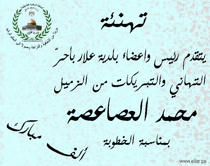 الف الف مليون مبروك للاستاذ (شادي ناجي عامر) بمناسبة زواجه الميمونبارك الله لك وبارك عليك وجمع بينكما على خير