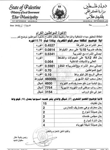 المواطنين الكرام تماشيا مع توجه بلدية علار الدائم بسياسة الافصاح ونشر المعلومات وتحقيقا لمبدأ الشفافية والنزاهة نرفق لكم تقرير تفصيلي لتكلفة كيلو الكهرباء وسبب بيعها بـ .7 اغورة