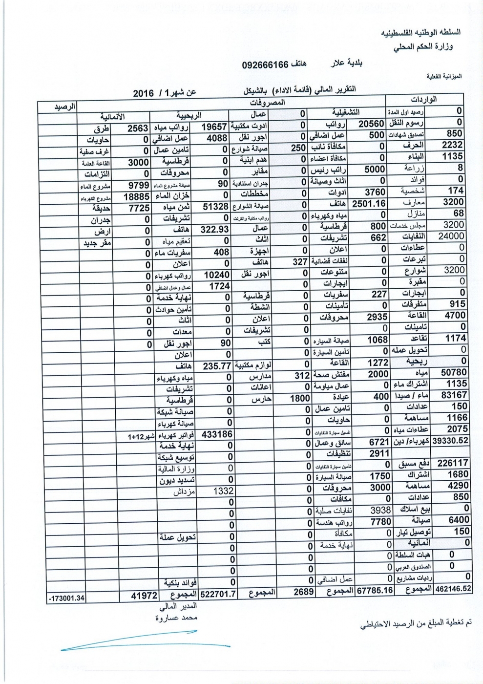 التقرير المالي عن شهر 01-2016