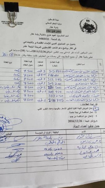 جرى اليوم في بلدية علار فتح عطاء مشروع تعبيد طرق داخلية وذلك بحضور المهندس احمد زنديق ممثلا عن وزارة الحكم المحلي وبلدية علار والشركات التي تقدمت للعطاء بالاضافة الى ممثلين عن المجتمع المحلي , وقد تمت احالة العروض المقدمة الى لجنة فنية حتى تتم دراستها .