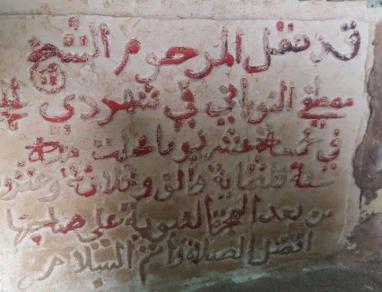 " قد انتقل المرحوم الشيخ مصطفى النوباني في شهر ذي الحجة في خمسة عشرة يوما خلت منه سنة ثلاثمائة والف وثلاثٌ وعشرون من بعد الهجرة النبوية على صاحبها افضل الصلاة واتم التسليم . "