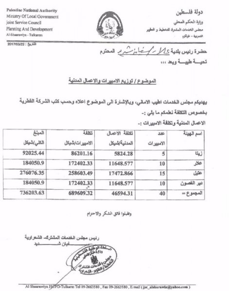 تحت رعاية عطوفة محافظ محافظة طولكرم عقد اليوم في مقر مجلس الخدمات المشترك - الشعراوية اجتماع ضم رؤساء الهيئات المحلية ( زيتا - عتيل - دير الغصون - علار ) بالاضافة الى الاخ مجدي أبو ليمون ممثلا عن المحافظة وذلك لتثبيت آلية توزيع الامبيرات الجديدة التي حصلت عليها منطقة الشعراوية بالاضافة الى توزيع التكاليف على حسب الامبيرات