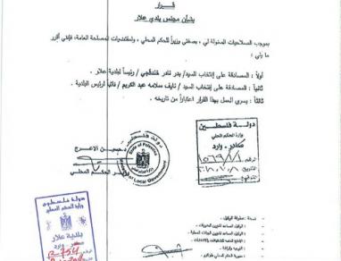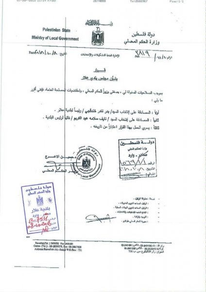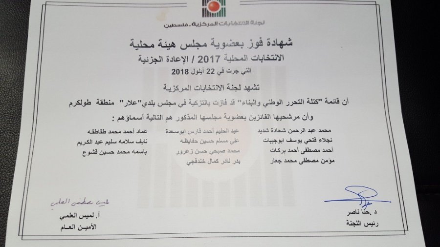 بحمد الله تعالى تم اليوم في بلدية علار تسليم واستلام مهام ادارة البلدية الى المجلس البلدي الجديد برئاسة السيد بدر خندقجي , حيث حضر مراسم التسليم المهندس اياد خلف مدير عام حكم محلي طولكرم وممثلين عن الوزارة بالاضافة الى ممثلين عن حركة التحرير الوطني الفلسطيني فتح / منطقة علار ورؤساء وممثلين المؤسسات في البلدة بالاضافة الى مدير مركز شرطة علار .